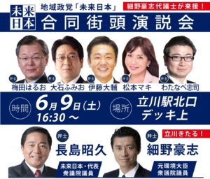 地域政党「未来日本」合同街頭演説会を6/9(土)16:30~立川駅北口で開催!細野豪志代議士が来援!